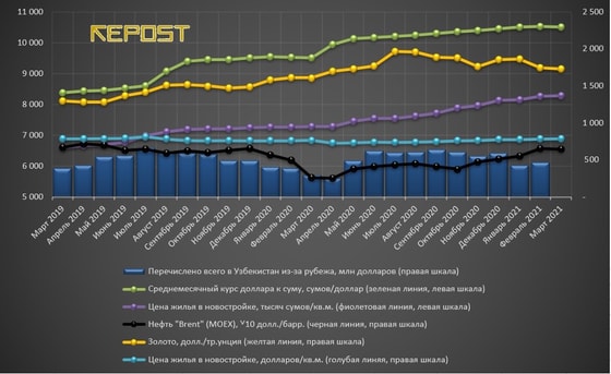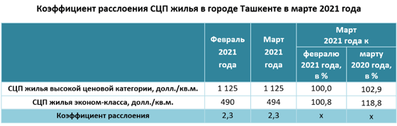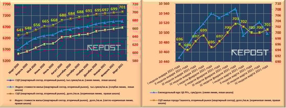 Индекс стоимости жилья (средняя цена предложения, скорректированная на усреднённый размер дисконта или скидки при совершении сделок между продавцами и покупателями квартир) в марте 2021 года по сравнению с уровнем предыдущего месяца вырос в долларовом выражении на 0,5 % до значения 662 доллара/кв. м, а в сумовом, соответственно, на 0,2 % и 6 954,3 тысячи сумов/кв. м.