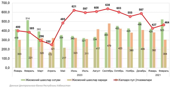 Центральный банк Узбекистана проинформировал о международных трансграничных денежных переводах физических лиц, поступивших в республику в феврале 2021 года. Отмечается, что объём международных трансграничных денежных переводов в январе 2021 года составил 427 млн долларов, в феврале – 464 млн долларов. По сравнению с февралём 2020 года в феврале текущего года достигнут рост денежных переводов в 1,2 раза.