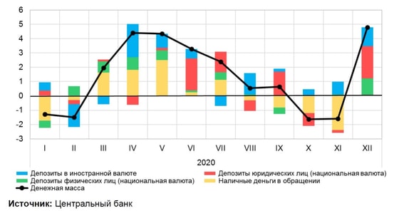 В Обзоре денежно-кредитной политики за IV квартал 2020 года ЦБ отмечает: «В 2020 году произошло небольшое замедление темпов роста депозитов физических лиц в национальной валюте (снижение на 13,5 процентных пункта по сравнению с 45,1 % в 2019 году), что в первую очередь связано с использованием сбережений из-за снижения доходов в условиях пандемии. Также во второй половине 2020 года на фоне действующего механизма приемлемых процентных ставок произошло снижение процентных ставок по депозитам, что привело к замедлению роста сбережений.