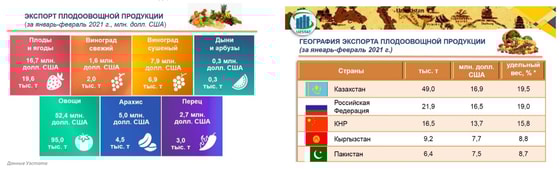 Ускоренными темпами развивались такие отрасли сельского хозяйства, как плодоовощеводство, садоводство и виноградарство. Так, в январе-феврале 2021 года доля плодоовощной продукции в общем объёме экспорта составила 5,8 %. По итогам января-февраля 2021 года наибольший объем в стоимостном выражении экспорта плодоовощной продукции приходится на Казахстан (19,5 % от всего объёма плодоовощной продукции). Казахстанские и российские потребители традиционно предпочитают продукты из постсоветских республик. Узбекистан, как страна, обладающая почти идеальными природными условиями для развития сельского хозяйства, имеет особое значение для Казахстана и России в этом отношении.