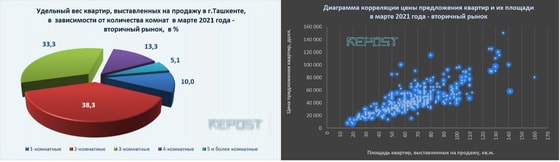 В марте 2021 года в Ташкенте наблюдалось разнонаправленное движение цен предложения по районам. Наибольший прирост за месяц показала СЦП в Бектемирском, Шайхонтохурском и Юнусабадском районах – по 0,5 %. Снижение СЦП за март наблюдалось в Мирабадском районе (на 0,1 %).