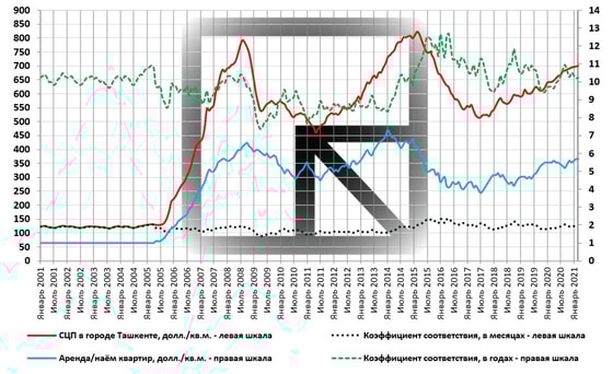 На графике представлены коэффициенты соответствия величин найма и стоимости жилья. Это время (месяцы или годы), необходимое для того, чтобы сумма платы за наём жилья сравнялась с рыночной стоимостью квартиры. В марте 2021 года этот показатель в среднем по Ташкенту составил 123 месяца (сохранился на уровне февраля текущего года) или 10 лет и 3 месяца.