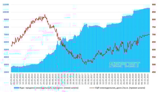 Кроме проводимых карантинных мероприятий на рынок жилья негативно влияет резкая девальвация национальной валюты, проведённая ЦБ в целях обеспечения эффективного курса сума по отношению к национальным валютам стран-соседей, прежде всего, это относится к РФ и Казахстану. Изменение стоимости национальной валюты, несомненно, влияет на рыночную цену квартир. Обычно наблюдается обратная зависимость: при укреплении курса доллара по отношению к суму, цена предложения в долларовом эквиваленте снижается. Но, начиная с августа 2017 года, цена предложения квадратного метра квартир в столице, выраженная в долларах, растёт и при обесценении сума.