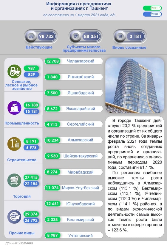 На 1 марта 2021 года в Ташкенте было зарегистрировано 3 181 вновь созданных предприятий и организаций.