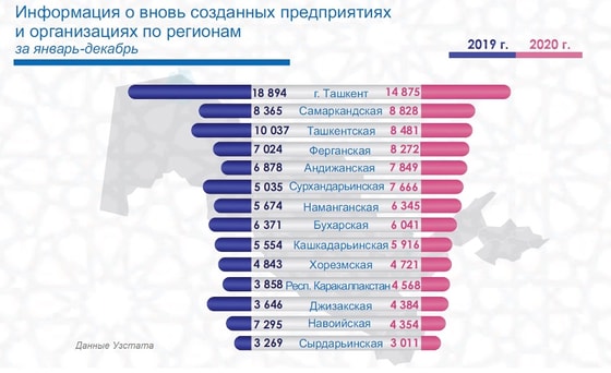 Поддержке рынку аренды оказывает и появление новых субъектов предпринимательства. Наблюдается активность по организации новых предприятий и организаций в Ташкенте. За 2020 год в Ташкенте было создано 14 875 предприятий.