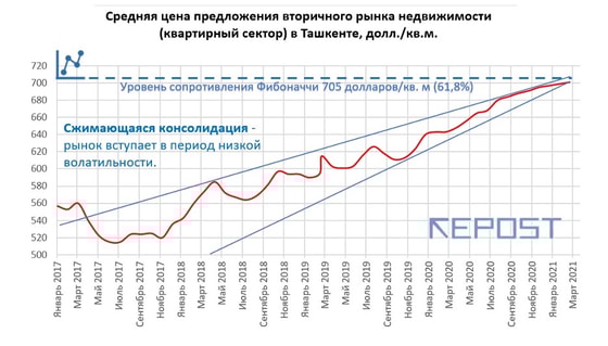 В результате в марте 2021 года средняя цена предложения жилья на вторичном рынке (квартирный сектор) также не смогла протестировать уровень сопротивления Фибоначчи 705 долларов/кв. м (61,8 %). Но рынок постепенно подходит к этому уровню сопротивления и консолидируется.
