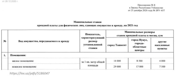 В соответствии с законом «О Государственном бюджете Республики Узбекистан на 2021 год» установлены минимальные ставки арендной платы для физических лиц, сдающих имущество в аренду, на 2021 год.
