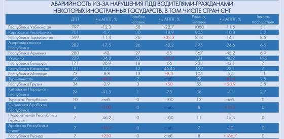 Первые строчки рейтинга виновных в ДТП иностранцев были присвоены Узбекистану (797 аварий), Кыргызстану (701), Таджикистану (599), Азербайджану (282) и Армении (280).