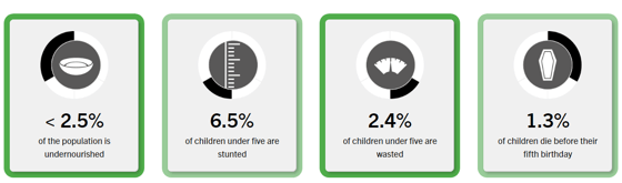 Согласно исследованию, в Узбекистане менее 2,5% от общего населения страдают от недоедания. У 6,5% детей наблюдается задержка роста, еще у 2,4% — истощение. Смертность детей в возрасте до пяти лет не превышает отметки 1,3%.