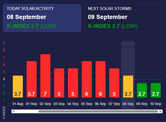 Согласно прогнозу, 9 сентября геомагнитный показатель опустится до низких значений.