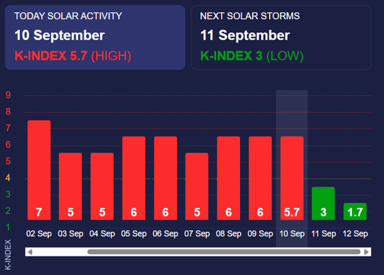 Сегодня (10 сентября) на Земле наблюдается «красная» магнитная буря, сообщает Meteoagent.