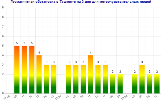 Сегодня (17 апреля) в Ташкенте наблюдается магнитная буря мощностью пять баллов, следует из данных сервиса Meteonova.
