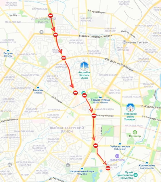 На нескольких улицах Ташкента временно ограничат движение транспорта, сообщает пресс-служба столичного УБДД ГУВД.