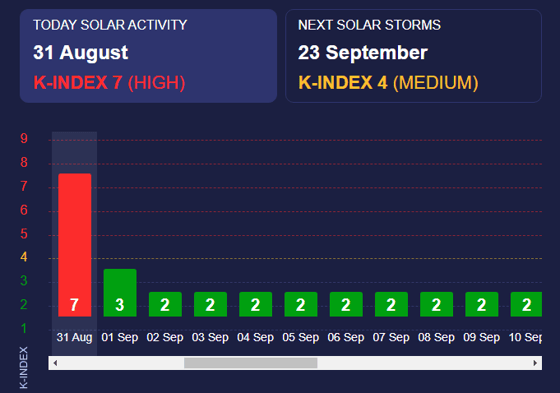 Геомагнитный показатель должен упасть до минимальных значений в воскресенье (1 сентября).