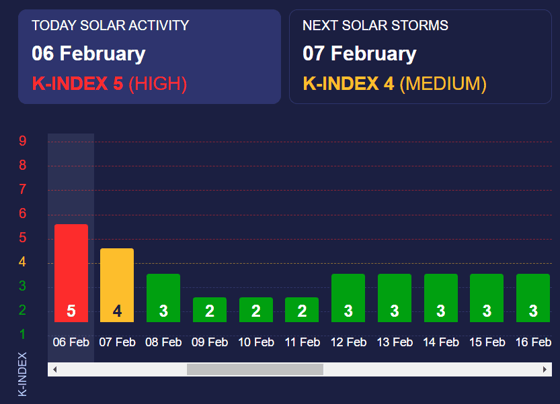 Завтра (7 февраля) будет наблюдаться «желтая» магнитная буря, послезавтра (8 февраля) показатель опустится до минимальных значений.