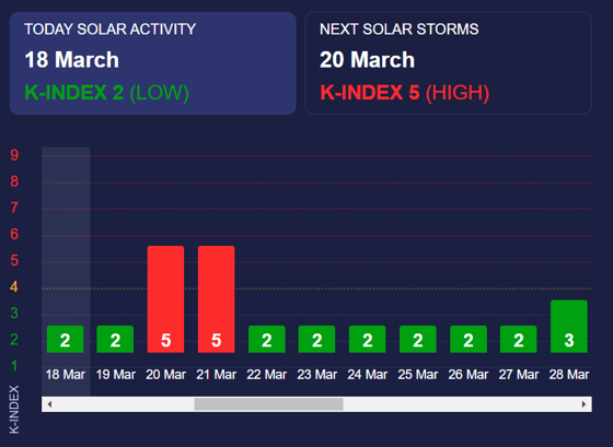 В среду и четверг (20-21 марта) на Землю обрушится магнитная буря красного уровня (K-индекс 5), сообщает Meteoagent.