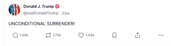 Спустя несколько минут Дональд Трамп опубликовал еще один пост, в котором потребовал безоговорочной капитуляции от Ирана.