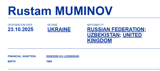 Узбекского предпринимателя Рустама Муминова включили в 19-й пакет санкций Европейского союза, принятый 23 октября.