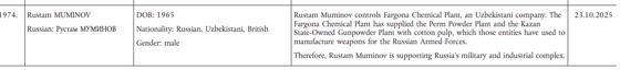 В Брюсселе считают, что Рустам Муминов контролирует Farg'ona Kimyo Zavodi (Ферганский химический завод по производству хлопковой целлюлозы). Утверждается, что продукция поставлялась на Пермский и Казанский пороховые заводы, материалы могли использоваться при производстве вооружений для ВС РФ.