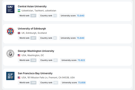 Кроме того, университет занял 1-е место в Узбекистане по критерию International Diversity, опередив другие вузы страны по уровню интернационализации. В рейтинге по финансовой устойчивости CAU оказался на 257-й позиции в мире, войдя в так называемую Silver League. Этот сегмент рейтинга особенно важен для оценки долгосрочной надёжности университетов: учитываются инвестиции в развитие кампуса, способность генерировать доходы для поддержки образовательных программ, а также усилия в направлении устойчивого и «зелёного» развития.