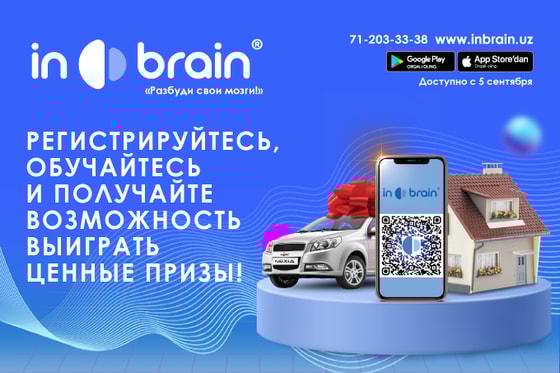 Регистрация на платформе In Brain уже началась, огромное количество желающих изучать языки и предметы школьной программы прошли регистрацию на сайте. Начать обучение вы сможете 5 сентября. Каждый, кто пройдет регистрацию и приобретет подписку до этого времени, автоматически становится участником розыгрыша 10 машин Nexia 3 и 5 квартир в Ташкенте, которые будут разыграны в честь запуска платформы In Brain.