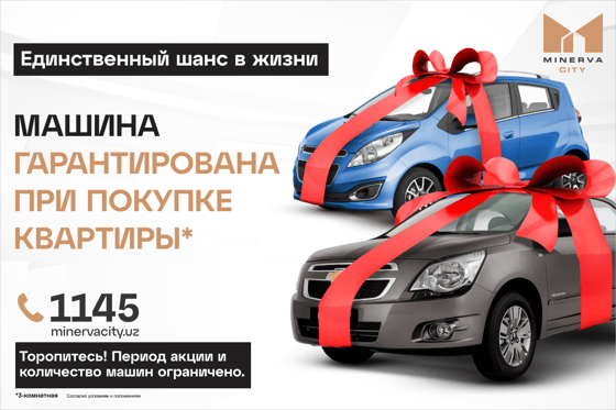 Minerva City рады представить акцию «2 ключа за 1», в рамках которой, вы можете приобрести 3-х комнатную квартиру в жилом комплексе и гарантированно получить автомобиль! Выбирая одну из двух типов 3-х комнатных квартир, вы получаете автомобиль марки Spark или Cobalt в подарок.