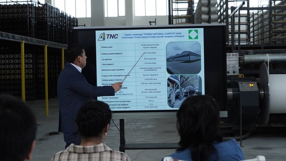 Один из таких крупных проектов — запущенный по инициативе ООО «TERMEZ NATIONAL CARPET», в городе Термез Сурхандарьинской области проект с производственной мощностью в размере 4,5 миллионов кв.м. ковров в год.