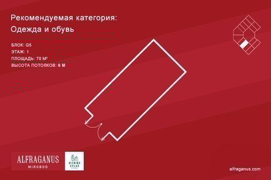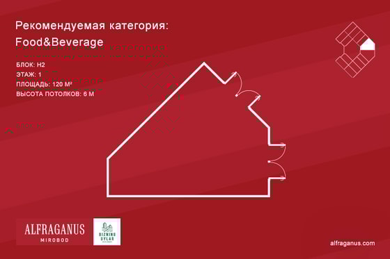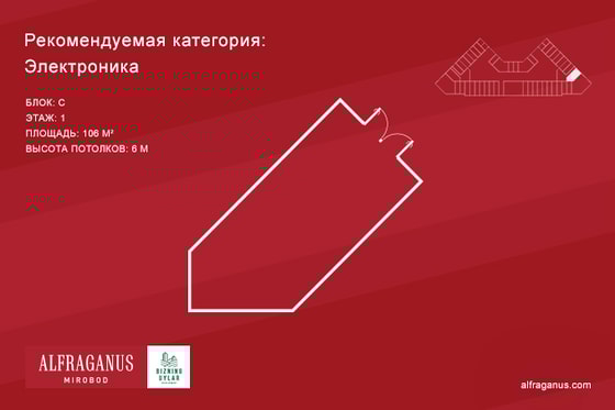 Помещение расположено в блоке C и рекомендуется под магазин техники и электроники, как и 90% помещений данного блока, что обеспечит стабильный поток новых клиентов. Также, преимуществом является достаточно близкое расположение к дороге, а значит вы будете одним из первых, кого увидят посетители, прибывшие в Alfraganus.