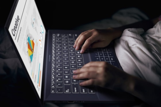 Клавиатура ExpertBook B9 также готова ко всем обстоятельствам мобильной жизни. Здесь установлен инновационный шарнир ErgoLift, который приподнимает ноутбук при открытии и дает возможность раскрыть его на 180 градусов при необходимости. Таким образом, руки комфортно лежат под небольшим углом и свободно передвигаются по всему блоку. Клавиши же обладают глубоким ходом и оптимальным откликом, что также придаст комфорт в работе.