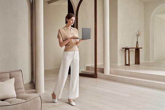 С толщиной всего 1,1 см и весом 1,2 кг, ASUS Zenbook S 14 получает значительное преимущество по компактности. Такие габариты дают возможность без труда брать его с собой куда угодно, не ощущая дополнительного веса.