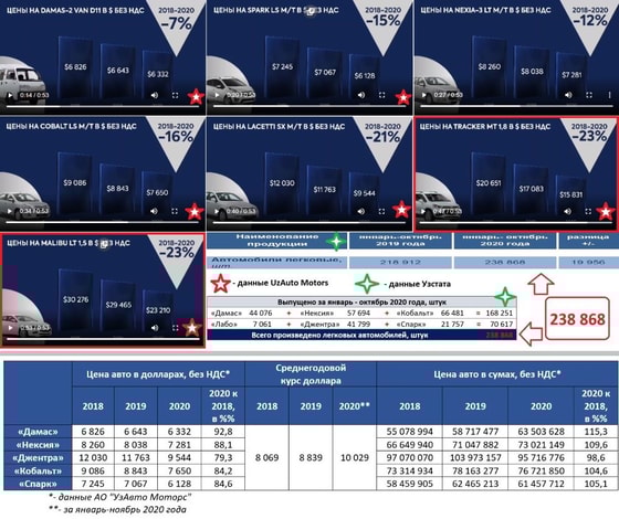 Сумовая цена на «Дамас» за 2018-2020 годы выросла на 15,3 процента; на «Нексию» - на 9,6; на «Кобальт» - на 4,6; на «Спарк» - на 5,1 процента. Лишь цена «Джентры» показала незначительное снижение за этот период на 1,4 процента. Ещё раз напомню, что это цены без НДС. При сравнении розничных цен с учётом НДС расхождения будут значительно выше приведённых значений.