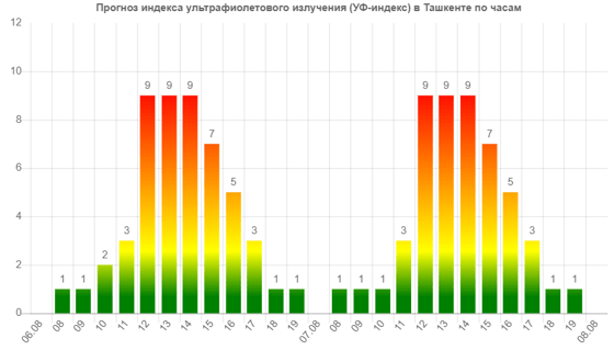 Уточняется, что девятибалльный показатель будет наблюдаться с 12:00 до 14:00. После этого уровень начнет постепенно снижаться. Аналогичная ситуация прогнозируется и на 7 августа.