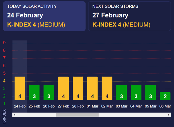 Завтра и послезавтра (25-26 февраля) ожидается низкий геомагнитный показатель. В дальнейшем на Землю обрушится затяжная магнитная буря, которая будет наблюдаться с 27 февраля по 2 марта.
