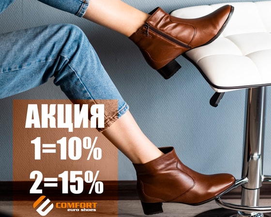 Каждый из нас очень тщательно подходит к выбору обуви, так как от выбора обуви зависит ваше здоровье, настроение и самокомфорта. Для того, чтобы вы чувствовал себя прекрасно этой осенью, Comfort Euro Shoes дарит вам скидки на покупку обуви: -10% на покупку одной пары обуви и -15% на покупку второй пары. Скидки действуют до 6 октября.