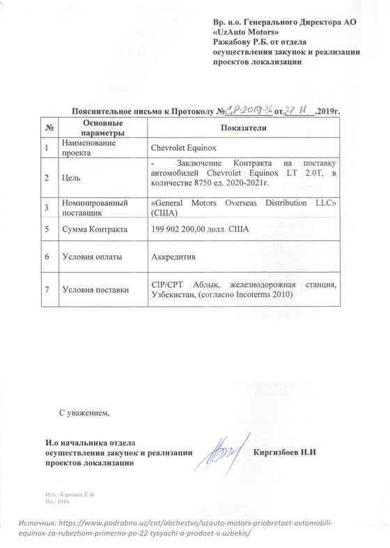 Например, АО UzAuto Motors заключила контракт на поставку в Узбекистан 8 750 автомобилей Chevrolet Equinox общей стоимостью 199,9 миллиона долларов. Контракт заключён скомпанией General Motors Overseas Distribution LLC в 2019 году. Срок поставки Chevrolet Equinox в Узбекистан определён 2020-2021 годы.