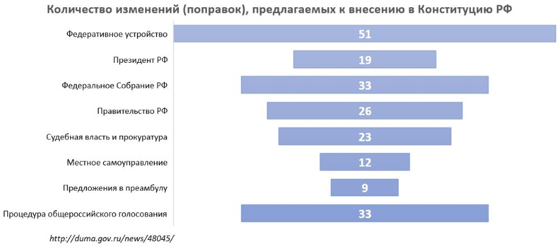 Всего в принятом законе указано 206 поправок, которые увеличивают общее содержание Конституции РФ более чем на 50 процентов. Голосования по каждой предложенной поправке не проводилось: на плебисцит выставлен весь пакет изменений. Вот распределение количества поправок по разным разделам Конституции РФ: