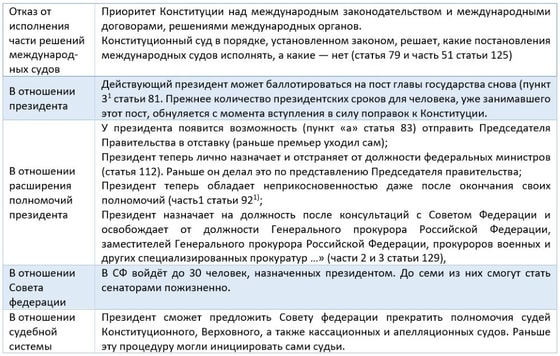 В основном законе России будет прописана возможность действующего и бывшего президентов [Путин и Медведев – прим. авт.] выдвигать свои кандидатуры ещё на два срока, изменились полномочия премьера и палат парламента, ввёлся новый порядок назначения правительства, установлены неприкосновенность экс-президентов и допустимость назначения пожизненных сенаторов.