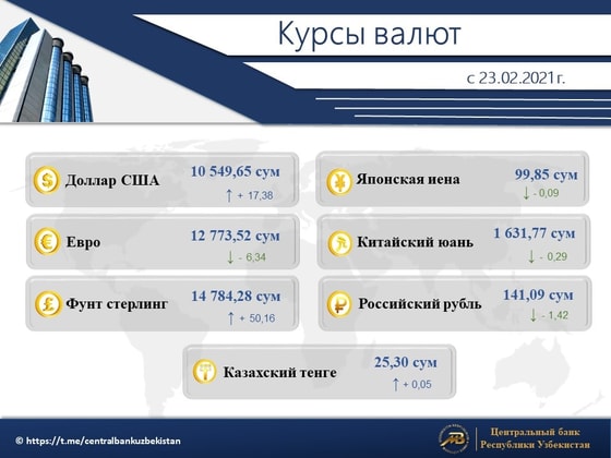 Центральный банк Узбекистана с 22 февраля установил новые курсы иностранных валют по отношению к суму. Курс доллара составил 10 549,65 (+17,38), а евро — 12 773, 52 (-6,34) сумов.