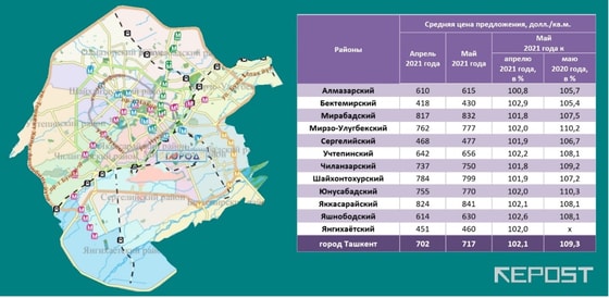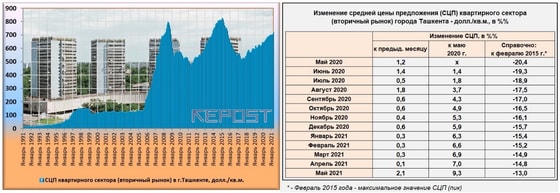 В мае 2021 года средняя цена предложения (СЦП) жилой недвижимости (квартирный сектор, вторичный рынок) города Ташкента составила 717 долларов/кв. м. Это на 2,1 % выше уровня аналогичного показателя предыдущего месяца (в апреле 2021 года прирост составил 0,1 %).