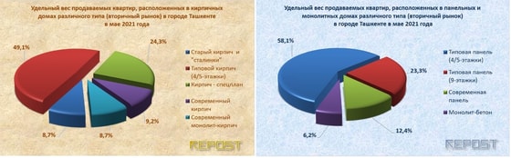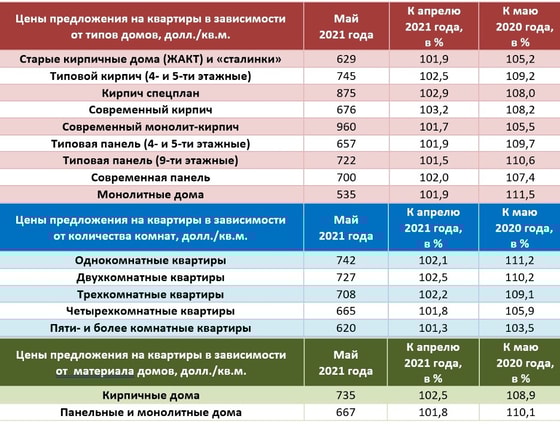 В мае 2021 года цены на квартиры, расположенные в старых кирпичных домах, скорректировались в сторону повышения на 1,9 % (629 долларов/кв. м). В 4-х и 5-ти этажных кирпичных домах типовой планировки СЦП достигла уровня 745 долларов/кв. м, что на 2,5 % превышает соответствующий показатель предыдущего месяца.
