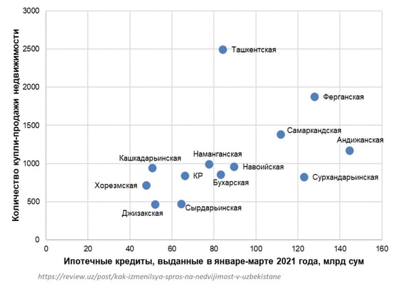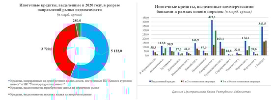 Лидирует по развитию ипотеки Ташкент, где в 2020 году объём выданных ипотечных кредитов вырос на 87,4 % или на 1 484,6 млрд сумов по сравнению с уровнем 2019 года; Навоийская область, соответственно, 81,9 % и 152,1 млрд сумов; Сырдарьинская — 63,2 % и 122,8 млрд сумов; Самаркандская область — 34,8 % и 225 млрд сумов.