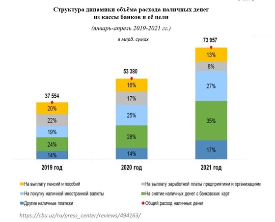 В целях сохранения денежных накоплений от их обесценения население начинает уходить в «спокойные гавани»: приобретать международные валюты, золото в слитках и объекты недвижимости. По сообщению Центрального банка, в январе-апреле текущего года наблюдается рост расхода наличных денег через кассы банков (в том числе через банкоматы) по сравнению с январём-апрелем 2020 года на 38,5 %. Основными причинами являются рост объёма снятия наличных денег с банковских карт на 10,9 трлн сумов по сравнению с январём-апрелем прошлого года (увеличение в 1,7 раза), а также возрастание объёма наличных денег, направленных на покупку иностранной валюты на 6,5 трлн сумов (увеличение в 1,5 раза).