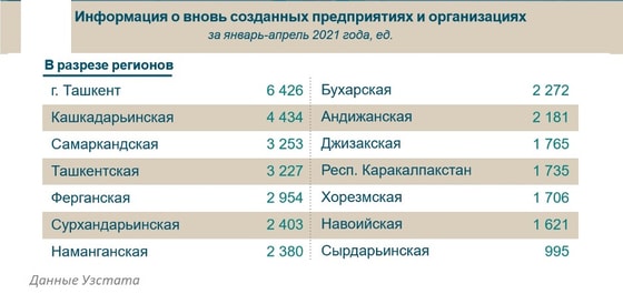 За январь-апрель 2021 года количество вновь созданных предприятий и организаций в Узбекистане составило 37,4 тысячи единиц. По сравнению с аналогичным периодом прошлого года, этот показатель увеличился на 8 242 единицы, а темп роста составил 128,3 %. По сравнению с соответствующим периодом прошлого года был отмечен значительный рост числа вновь созданных предприятий и организаций в Кашкадарьинской области (на 2 826 единиц), городе Ташкент (на 1 620 единиц), а также в Ферганской (на 1 217 единиц) и Бухарской (на 778 единиц) областях.