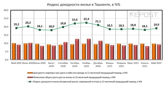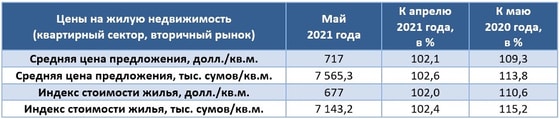 Индекс стоимости жилья (средняя цена предложения, скорректированная на усреднённый размер дисконта или скидки при совершении сделок между продавцами и покупателями квартир) в мае 2021 года по сравнению с уровнем предыдущего месяца вырос в долларовом выражении на 2,0 % до значения 677 долларов/кв. м, а в сумовом, соответственно, на 2,4 % и 7 143,2 тысячи сумов/кв. м.