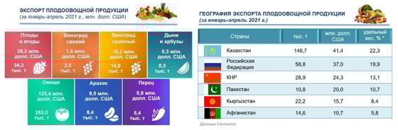 В январе-апреле 2021 года доля плодоовощной продукции в общем объёме экспорта составила 5,3 %. Основными рынками экспорта отечественной плодоовощной продукции являются Казахстан, Россия, КНР, Пакистан и Кыргызстан.