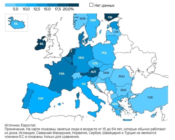 Около 12,3 % работающих людей в Европейском союзе работали дома из-за пандемии в 2020 году. Согласно данным Евростата ранее этот показатель составлял около 5 %. Цифры сильно различаются по странам Европы: более 25 % выполняли свою работу дома в Финляндии, в то время как в Болгарии этот показатель составлял всего 1,2 %.