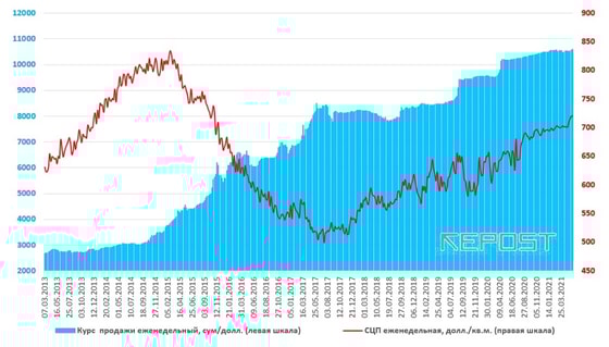 Кроме проводимых карантинных мероприятий на рынок жилья негативно влияет резкая девальвация национальной валюты, проведённая ЦБ в прошлом году в целях обеспечения эффективного курса сума по отношению к национальным валютам стран-соседей, прежде всего, это относится к РФ и Казахстану. Изменение стоимости национальной валюты, несомненно, влияет на рыночную цену квартир. Обычно наблюдается обратная зависимость: при укреплении курса доллара по отношению к суму, цена предложения в долларовом эквиваленте снижается. Но, начиная с августа 2017 года, цена предложения квадратного метра квартир в столице, выраженная в долларах, растёт и при обесценении сума.