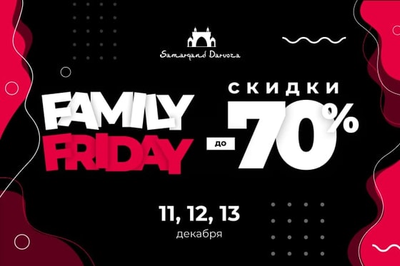 Приходите всей семьей на самый выгодный шопинг уходящего года. Только 11, 12, 13 декабря Family Friday со скидками 70% в ТРЦ Samarqand Darvoza.