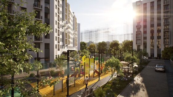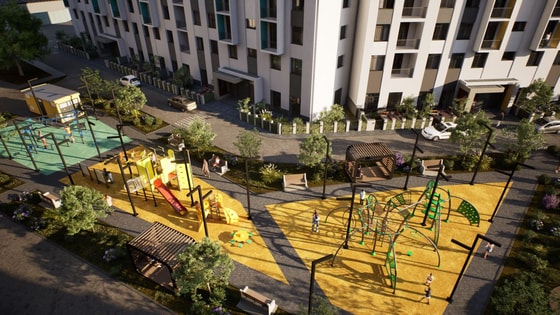 Внутри жилого комплекса развернута многофункциональная зона для тренировок, способная заменить оборудованный спортзал и обеспечить возможность занятий на свежем воздухе. Кроме того, во дворе организованы безопасные игровые зоны для детей разных возрастов, где расположена площадка с местами отдыха для родителей.