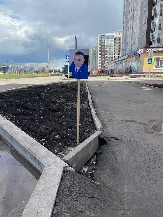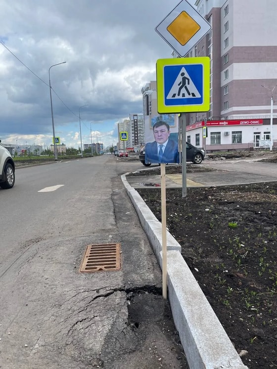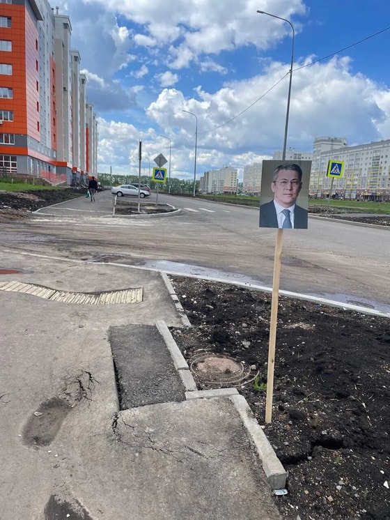 В Башкирии, городе Стерлитамаке ямы на дороге украсили портретами чиновников. Флешмоб организовал местный блогер, известный как Дядя Резо.